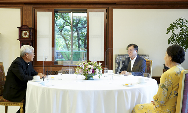 교황청 성직자성 장관으로 임명된 대전교구장 유흥식 대주교가 7월 12일 오후 청와대를 방문, 문재인(티모테오) 대통령과 김정숙(골룸바) 여사를 만나 환담했다. 유 대주교는 지난 6월 한국 성직자로서는 최초로 교황청 성직자성 장관에 임명돼 7월 29일 출국한다.