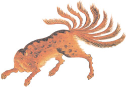 ‘다시 동쪽으로 300리를 가면 청구산이라는 곳인데 그 남쪽에서는 옥이, 북쪽에서는 푸른 흙이 많이 난다. 이곳의 어떤 짐승은 생김새가 여우 같은데 아홉 개의 꼬리가 있으며 그 소리는 마치 어린애 같고 사람을 잘 잡아먹는다. 이것을 먹으면 요사스러운 기운에 빠지지 않는다.’(남산경·南山經)