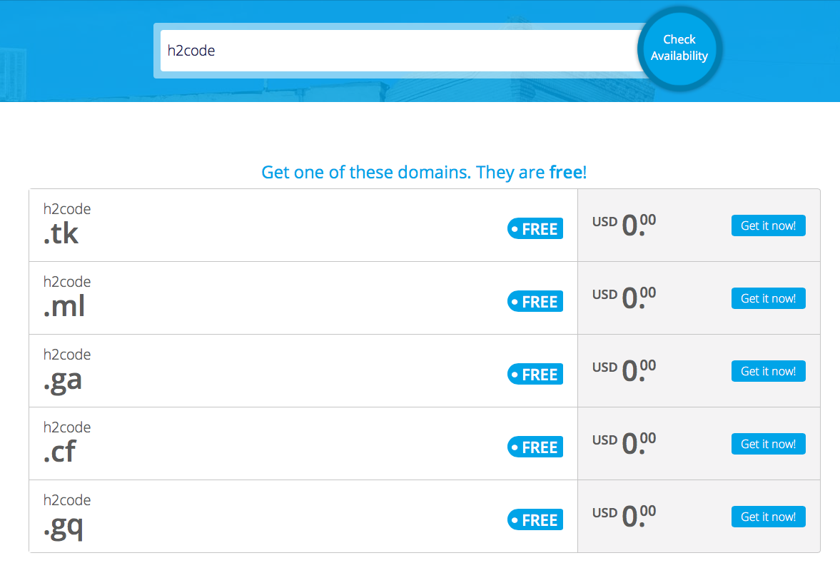Freenom 사이트에서 무료 국가 최상위 도메인을 제공 하고 있으며 아래 5개 국가의 최상위 도메인을 발급 받을 수 있습니다.