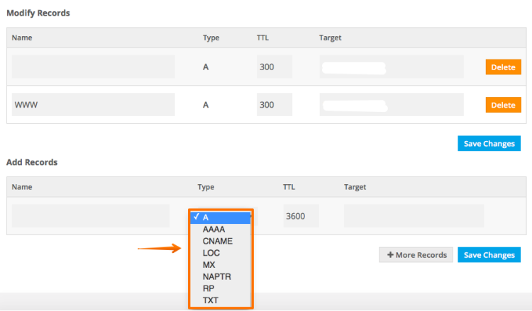 이 메뉴에서 추가적인 도메인 레코드를 생성 할 수 있습니다. Type 은 화면에 보이는 내용과 같고 안되는 타입은 없는 것으로 확인 됩니다.![]()