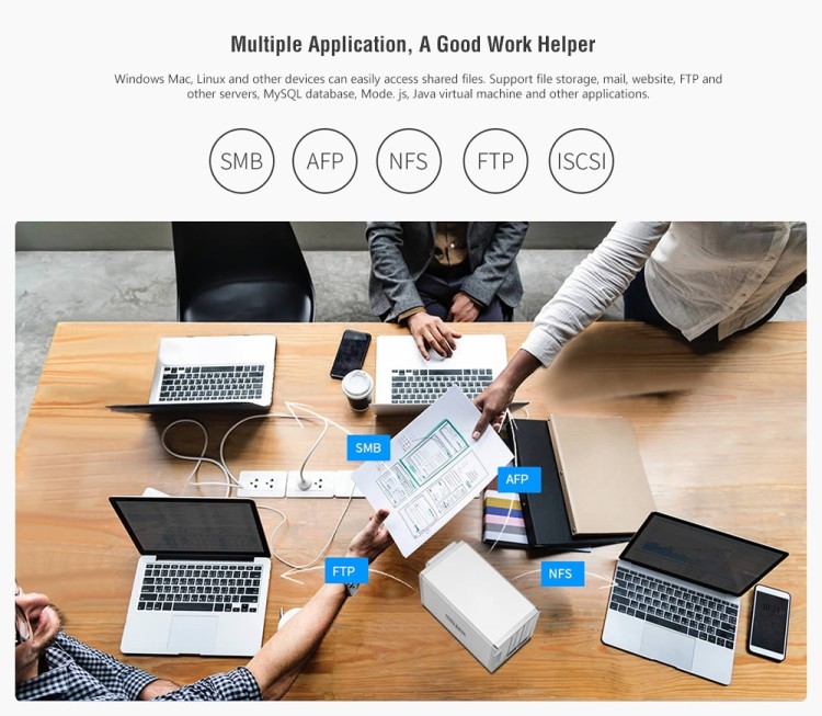 ● SMB, AFP, NFS, FTP, ISCSI 및 기타 프로토콜, Windows-Mac, Linux 및 기타 장치를 지원하여 공유