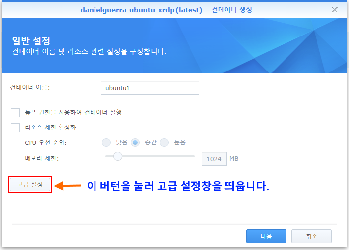 그러면 아래 [그림 5]와 같이 "컨테이너 생성" 화면이 나타나는데 "고급 설정" 버턴을 눌러 몇 가지 세부 설정을 하도록 합니다.