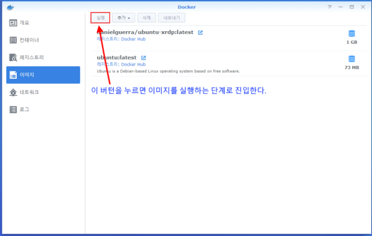 공유폴더가 준비되고 이미지 다운로드가 완료되어 "실행" 버턴이 활성화 되면 이 버턴을 누릅니다.
