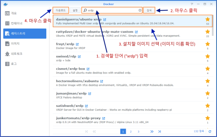 그러면 제일 상단(향후 위치는 바뀔 수 있습니다)에 "danielguerra/ubuntu-xrdp"로 표시되어 있는 이미지가 보이는데 이 이미지 위치를 마우스로 클릭하여 선택 후 "다운로드" 버턴을 누릅니다.