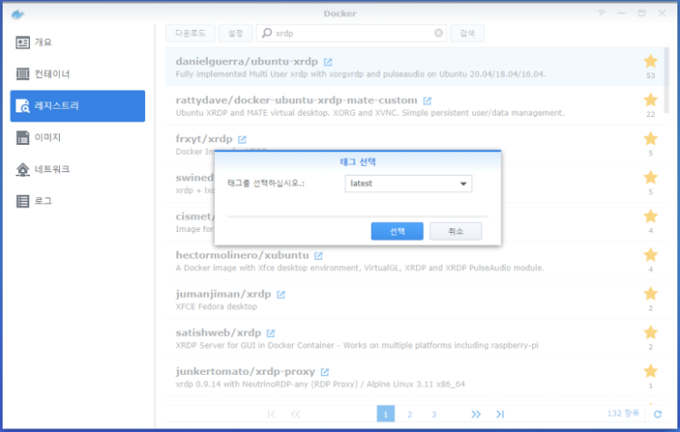 Docker 관리 화면의 좌측에 표기되어 있는 "레지스트리"를 클릭하고, "키워드 삽입"란에 "xrdp"를 입력한 후 "검색" 버턴을 클릭하면 [그림 1]과 같이 xrdp를 지원하는 docker 이미지 목록이 나타납니다.