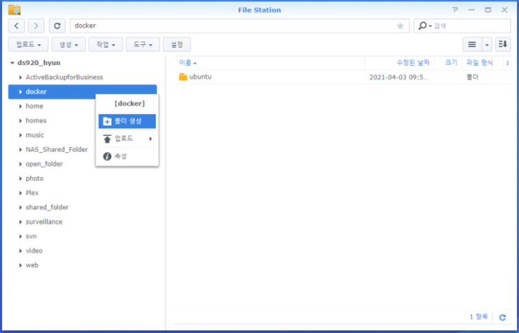 그리고 아래 [그림 4]와 같이 "docker" 폴더를 선택 후 마우스 오른 쪽 버턴을 눌러 팝업 메뉴가 뜨면 "폴더 생성" 메뉴를 클릭하고 폴더명을 "ubuntu"로 하여 폴더를 만듭니다.