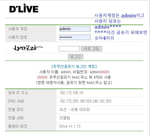 사용자 암호는 admin+MAC주소 4자리네요 ㅎ