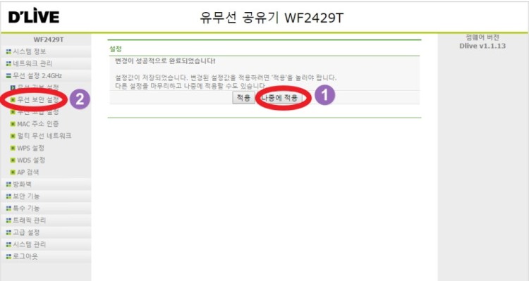 보안키(무선암호)에서 원하시는 암호를 입력한후 설정저장 적용을 누르시면 됩니다.