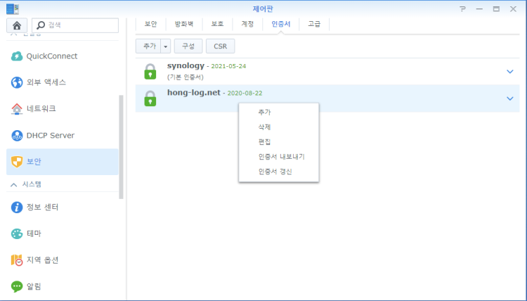 이 편리한 기능은 헤놀로지에서도 사용 할 수 있는데 Let’s Encrypt의 무료 인증서는 3개월마다 갱신을 해야하는데 이 기능은 원클릭으로 갱신까지 가능하기에 웹서버를 헤놀로지를 이용하여 운영중인 사람이라면 매우매우 유용하고 편리하게 사용할 수 있을 것이다