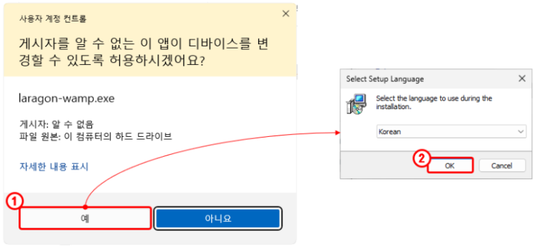 사용자 계정 컨트롤 창이 뜨면 [예]를 클릭(아래 ①번) 하면, 오른쪽 사진과 같이 제일 먼저 사용할 언어 선택 창이 나타나는데 원하는 언어를 선택하고 [OK] 버튼(아래 ②번)을 클릭한다.