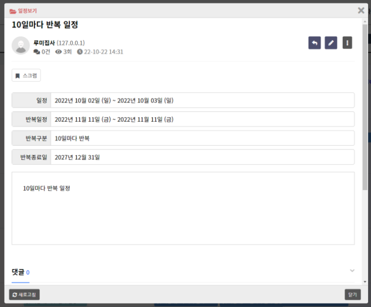 - 반복일정은 "반복종료일"까지 설정값에 따라 반복합니다.