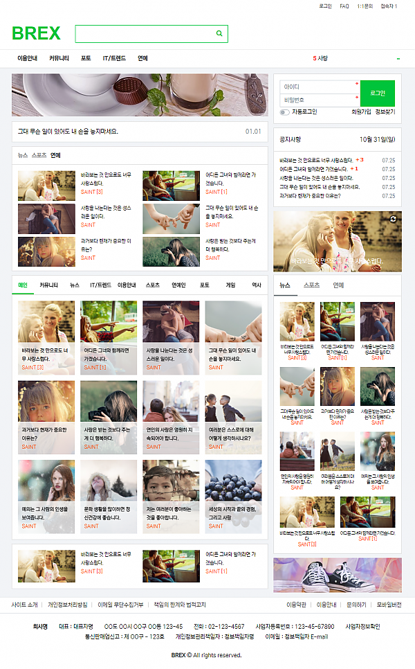 ※ 본 테마는 대한민국 포털 사이트인 네이버를 참고해 사용자들에게 친숙한 이미지를 주고자 제작되어진 것입니다.네이버 메인 -http://www.naver.com1. 브렉스 나리야 그린팩 1.0깔끔하고 분주한 느낌을 주는 비반응형/모바일 테마(분리형)포털 및 커뮤니티 구성에 용이(추후 영카트 버전 업데이트 예정)나리야에 아직 미숙한 사용자가 사용하기 적합2. 사용조건나리야에서 사용가능Bootstrap3, HTML5, CSS3IE8 이상, Chrome, Firefox, Safari, Opera, Swing 등3. 패키지 구성작성중4. …